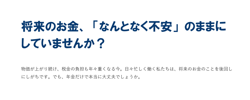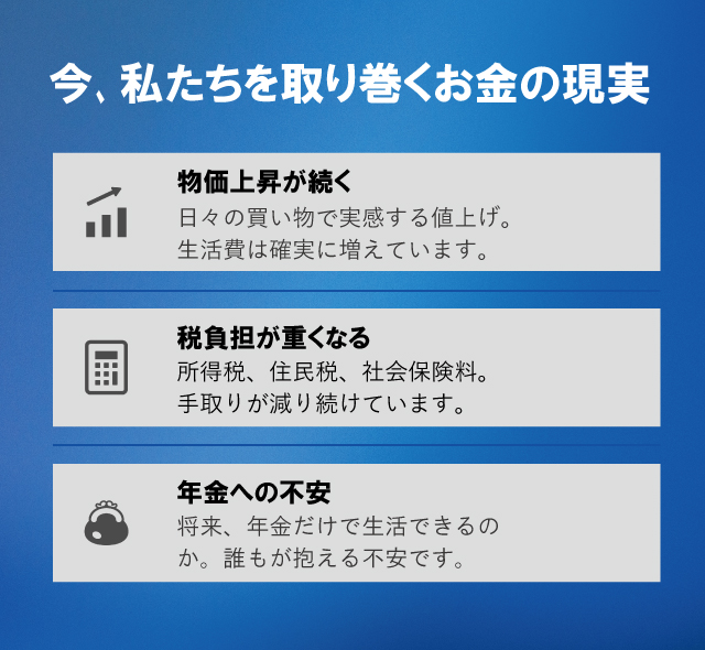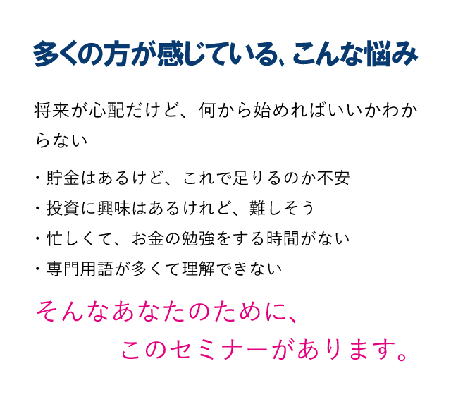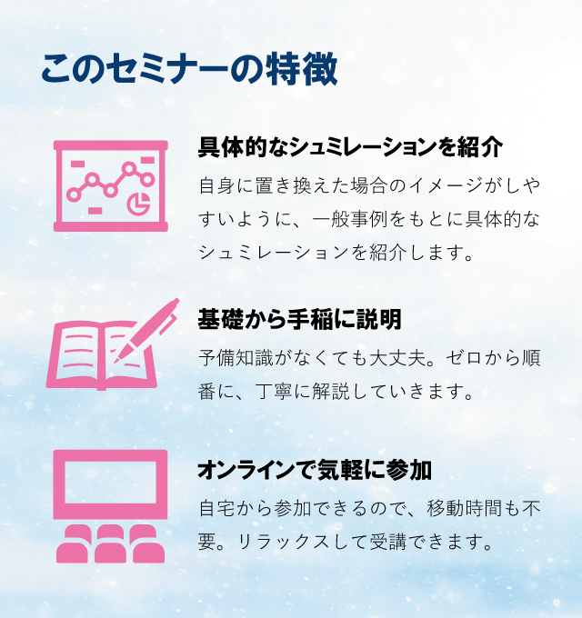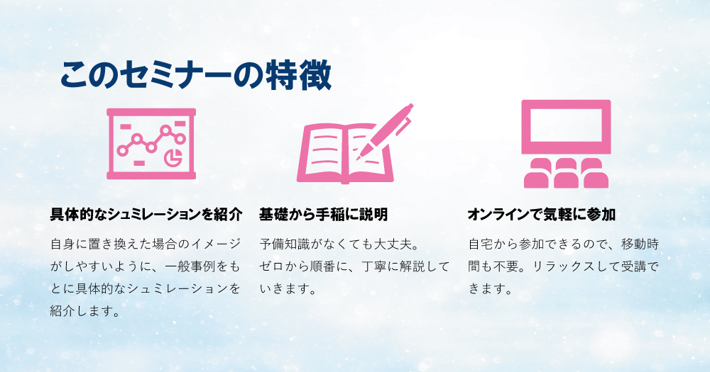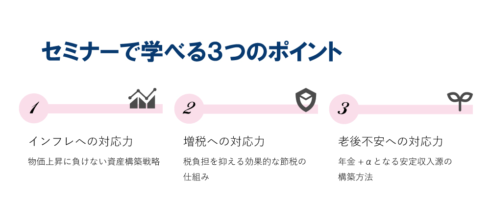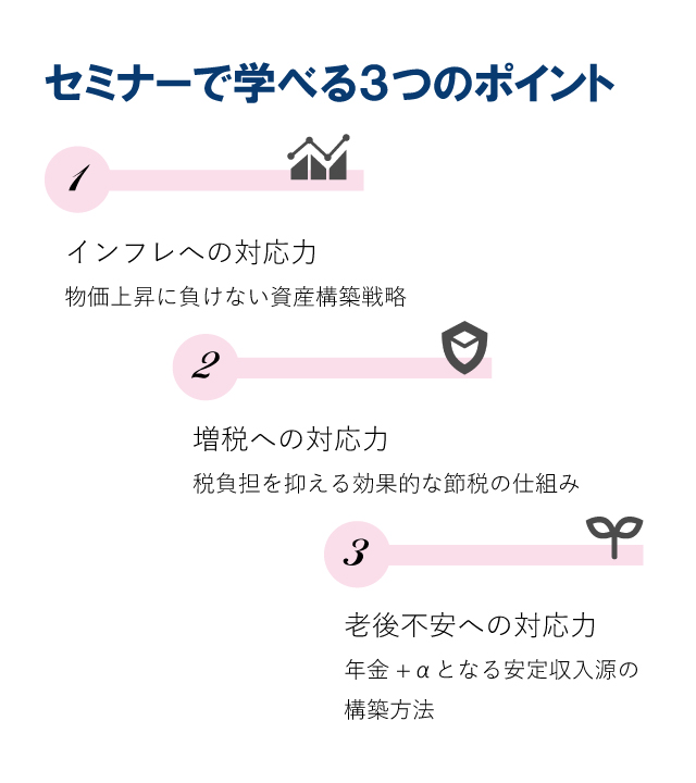 | 詳細 | 物価上昇、重い税負担、年金不安 先行き不透明な経済環境―― 「物価上昇」、「重い税負担」、「年金不安 」 本セミナーでは、資産を守りながら増やす超効率的投資法を隙間時間で学べる女性向けWEBマネーセミナーとして、初心者の方にもわかりやすく解説いたします。 「貯金はあるけど、これで足りるか不安」 また、当日は実際の事例を交えながら、インフレ時代におけるお金の考え方や仕組みなど、適切な資産形成方法をお届けします。 |